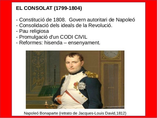 3. 3. EL CONSOLAT (1799-1804) - Constitució de 1808. Govern autoritari de Napoleó - Consolidació dels ideals de la Revolució. - Pau religiosa - Promulgació d'un CODI CIVIL - Reformes: hisenda – ensenyament. Napoleó Bonaparte (retrato de Jacques-Louis David,1812)
