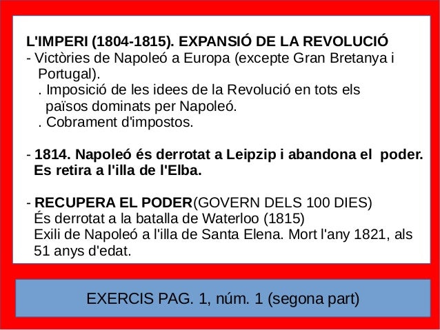 5. 5. L'IMPERI (1804-1815). EXPANSIÓ DE LA REVOLUCIÓ - Victòries de Napoleó a Europa (excepte Gran Bretanya i Portugal). . Imposició de les idees de la Revolució en tots els països dominats per Napoleó. . Cobrament d'impostos. - 1814. Napoleó és derrotat a Leipzip i abandona el poder. Es retira a l'illa de l'Elba. - RECUPERA EL PODER(GOVERN DELS 100 DIES) És derrotat a la batalla de Waterloo (1815) Exili de Napoleó a l'illa de Santa Elena. Mort l'any 1821, als 51 anys d'edat. EXERCIS PAG. 1, núm. 1 (segona part)