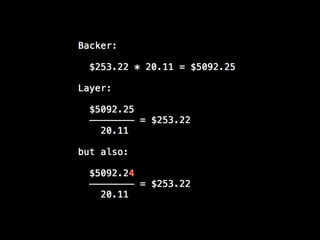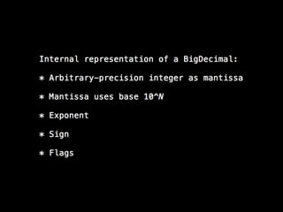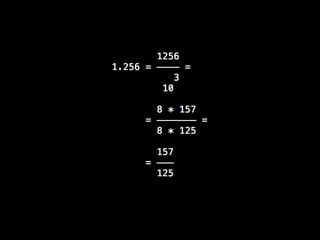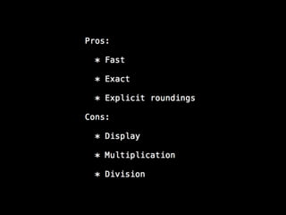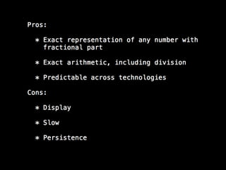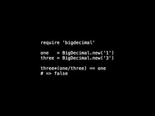 This is a talk about numbers in Ruby I gave at Rails Israel 2013. We cover their representation, and the theoretical properties (only elemental math involved) behind their limitations. I take as driver of the talk my experience building an online betting website with some colleagues, and the theoretical challenges we faced to build a zero-sum system. Most of this talk is actually language-independent.