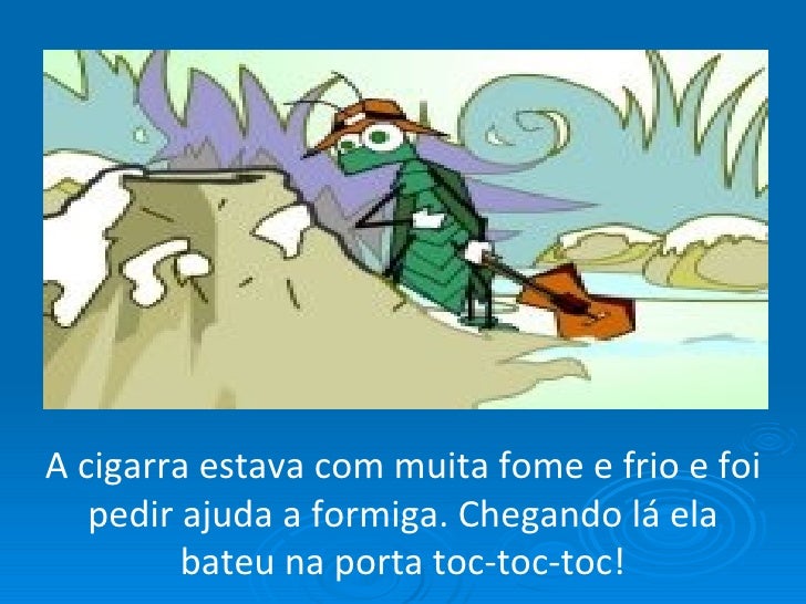 10. 10. A cigarra estava com muita fome e frio e foi pedir ajuda a formiga. Chegando lá ela bateu na porta toc-toc-toc!