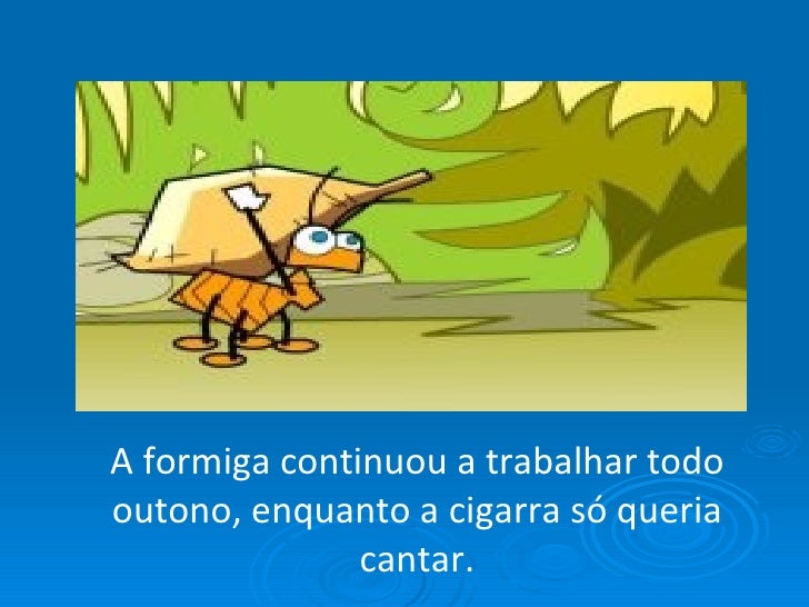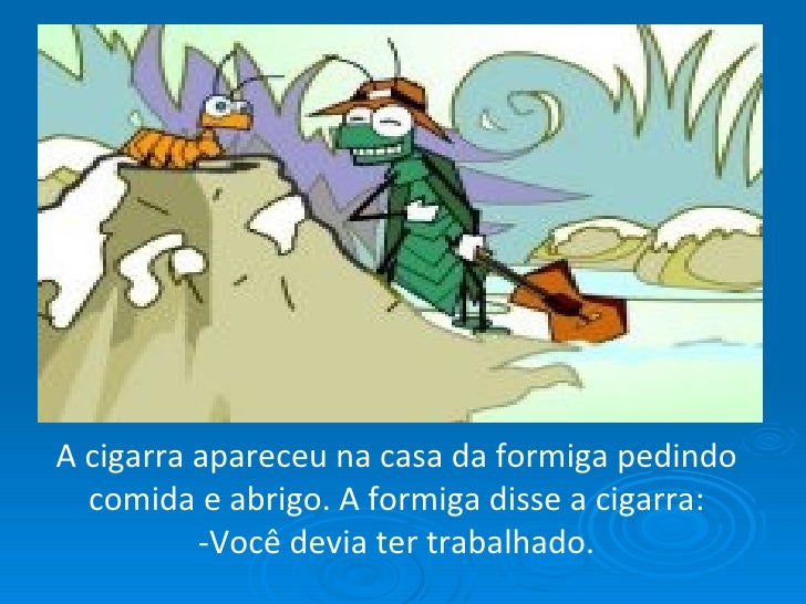 3. 3. De repente apareceu a formiga e perguntou a cigarra: - Por que você não está trabalhando? E a cigarra respondeu: - Pra que tanto trabalhar eu gosto de cantar.