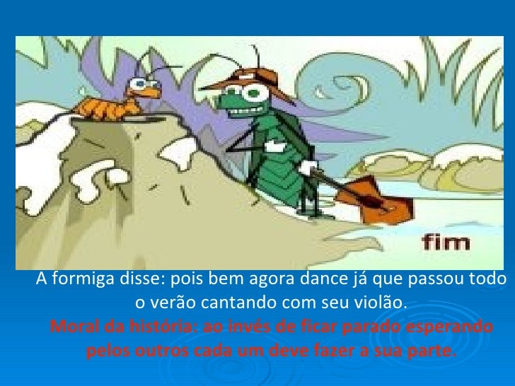 12. 12. A formiga disse: pois bem agora dance já que passou todo o verão cantando com seu violão. Moral da história: ao invés de ficar parado esperando pelos outros cada um deve fazer a sua parte.