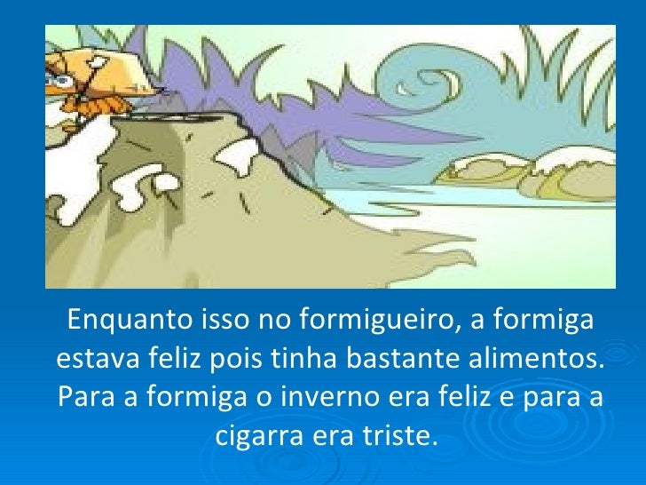 9. 9. Enquanto isso no formigueiro, a formiga estava feliz pois tinha bastante alimentos. Para a formiga o inverno era feliz e para a cigarra era triste.