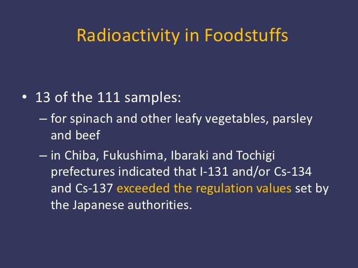 12. 12. I-131, Cs-134 and Cs-137 were either not detected or were below the regulation values set by the Japanese authorities.</li></li></ul><li>Radioactivity in Foodstuffs<br />13 of the 111 samples:<br />for spinach and other leafy vegetables, parsley and beef <br />in Chiba, Fukushima, Ibaraki and Tochigi prefectures indicated that I-131 and/or Cs-134 and Cs-137 exceeded the regulation values set by the Japanese authorities.<br />