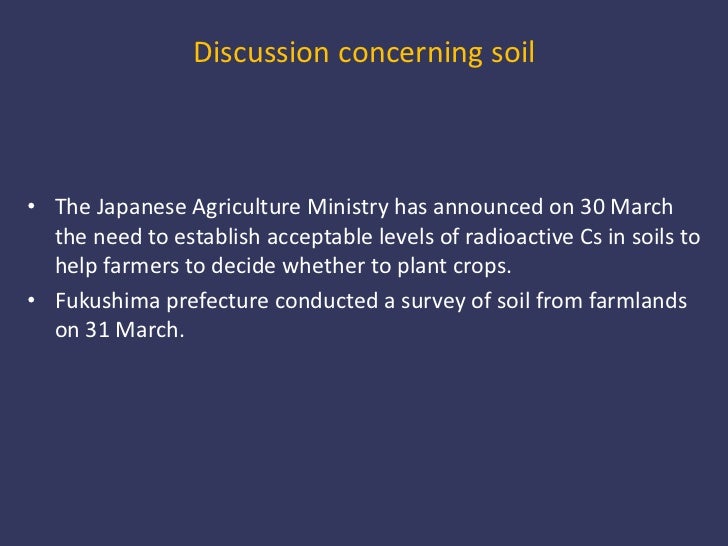 13. 13. Discussion concerning soil<br />The Japanese Agriculture Ministry has announced on 30 March the need to establish acceptable levels of radioactive Cs in soils to help farmers to decide whether to plant crops. <br />Fukushima prefecture conducted a survey of soil from farmlands on 31 March.<br />