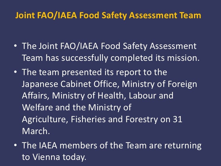 Joint FAO/IAEA Food Safety Assessment Team<br /><ul><li>The Joint FAO/IAEA Food Safety Assessment Team has successfully co...