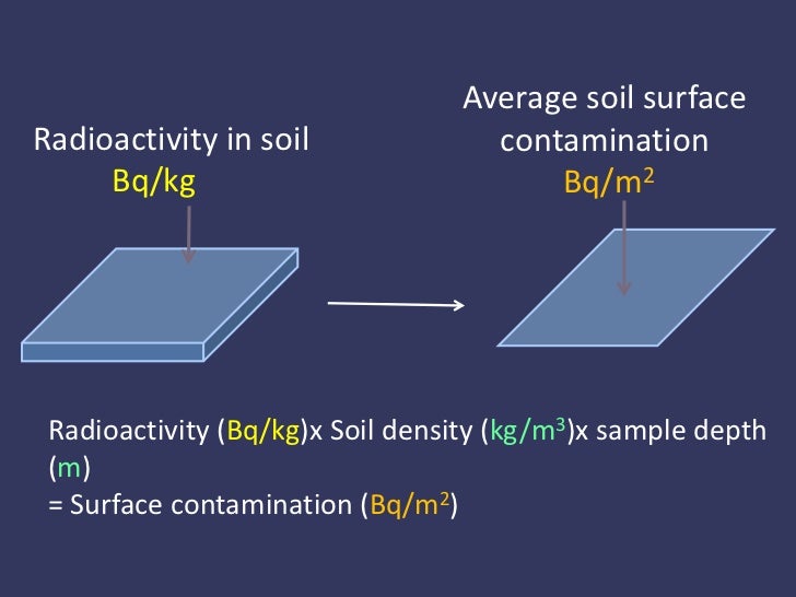 17. 17. Radioactivity in soil Bq/kg<br />Average soil surface contamination<br />Bq/m2<br />Radioactivity (Bq/kg)x Soil density (kg/m3)x sample depth (m)<br />= Surface contamination (Bq/m2)<br />