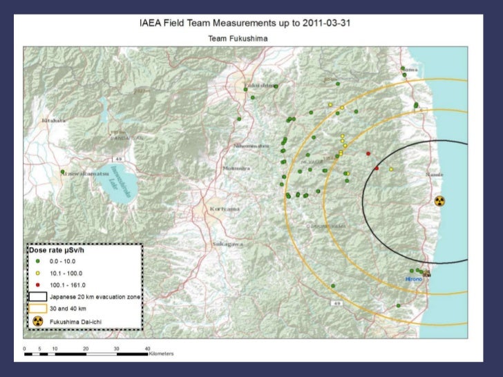 3. 3. Measurements of the IAEA team<br />March, 31- April 1, Fukushima Team1 and 2 <br />1 April, FT2 and FT3 altogether as succession process.<br />7 different points of radius of 23 to 58 km from the Fukushima NPP<br />Dose rates: 0.4 to 5 µSv/h<br />Beta-gamma contamination: 0.01 to 0.49 MBq/m2<br />Several gamma spectra, air samples and smears collected<br />No alpha particles detected in the air. <br />2 April, FT2 back to Tokyo, and then to Vienna<br />March 31, Tokyo team  <br />31st was the last day for Tokyo-team<br />