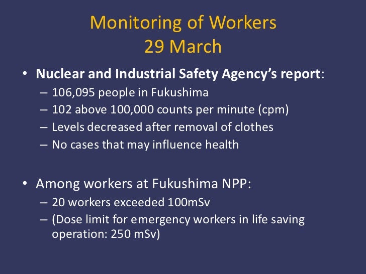 Monitoring of Workers29 March<br />Nuclear and Industrial Safety Agency’s report:<br />106,095 people in Fukushima<br />10...