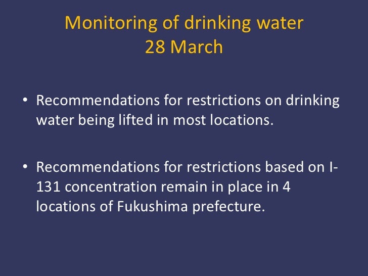 8. 8. Monitoring of drinking water28 March<br />Recommendations for restrictions on drinking water being lifted in most locations. <br />Recommendations for restrictions based on I-131 concentration remain in place in 4 locations of Fukushima prefecture. <br />