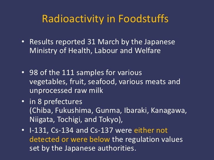 Radioactivity in Foodstuffs<br /><ul><li>Results reported 31 March by the Japanese Ministry of Health, Labour and Welfare
