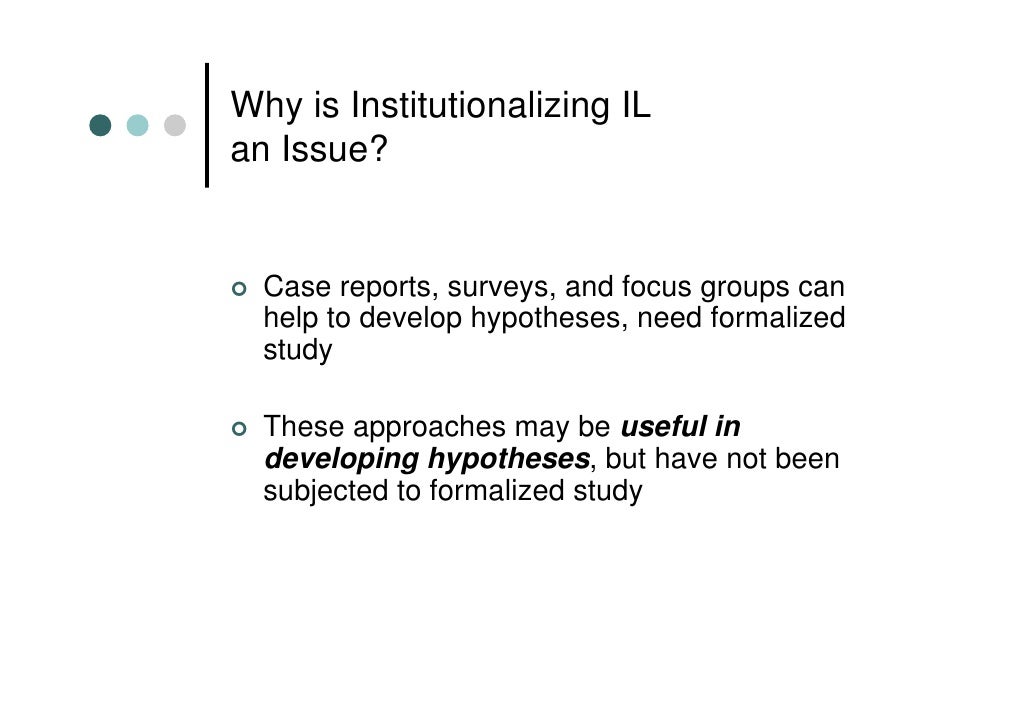 10. 10. Why is Institutionalizing ILan Issue? Case reports, surveys, and focus groups can help to develop hypotheses, need formalized study These approaches may be useful in developing hypotheses, but have not been subjected to formalized study