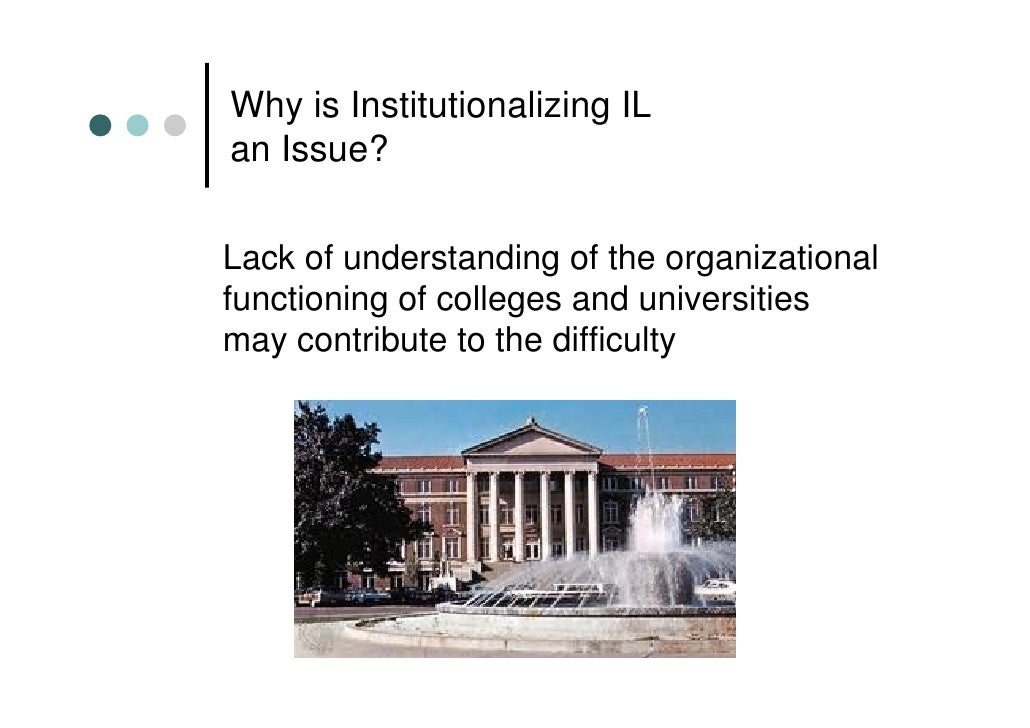 11. 11. Why is Institutionalizing ILan Issue?Lack of understanding of the organizationalfunctioning of colleges and universitiesmay contribute to the difficulty