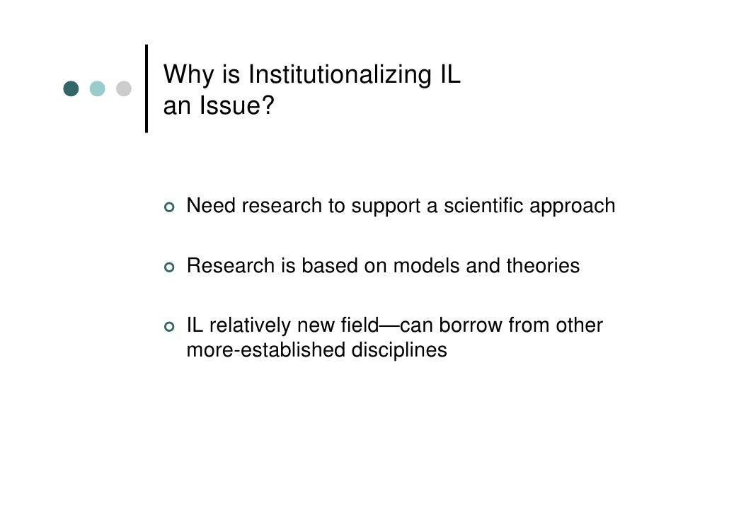 12. 12. Why is Institutionalizing ILan Issue? Need research to support a scientific approach Research is based on models and theories IL relatively new field—can borrow from other more-established disciplines
