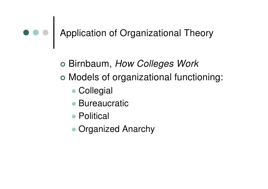 13. 13. Application of Organizational Theory Birnbaum, How Colleges Work Models of organizational functioning:  Collegial  Bureaucratic  Political  Organized Anarchy