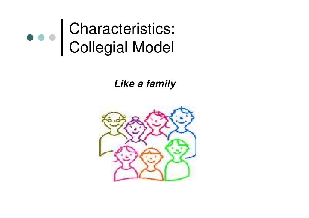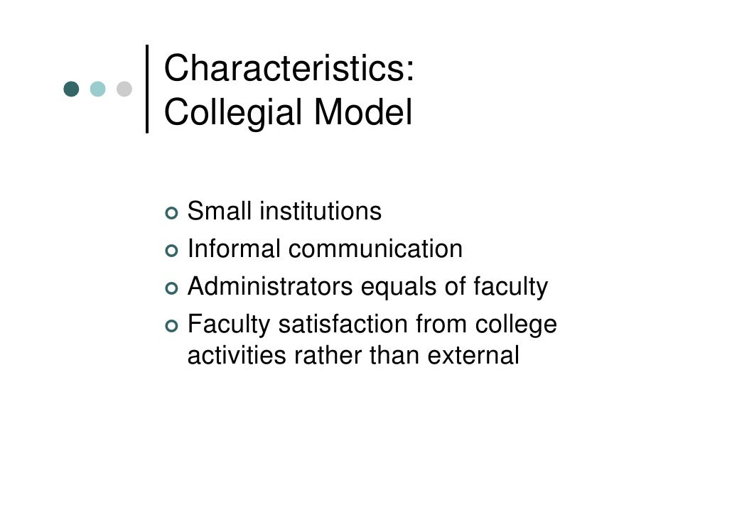 Characteristics:Collegial Model Small institutions Informal communication Administrators equals of faculty Faculty sat...