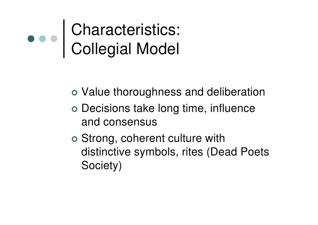 15. 15. Characteristics:Collegial Model Value thoroughness and deliberation Decisions take long time, influence and consensus Strong, coherent culture with distinctive symbols, rites (Dead Poets Society)