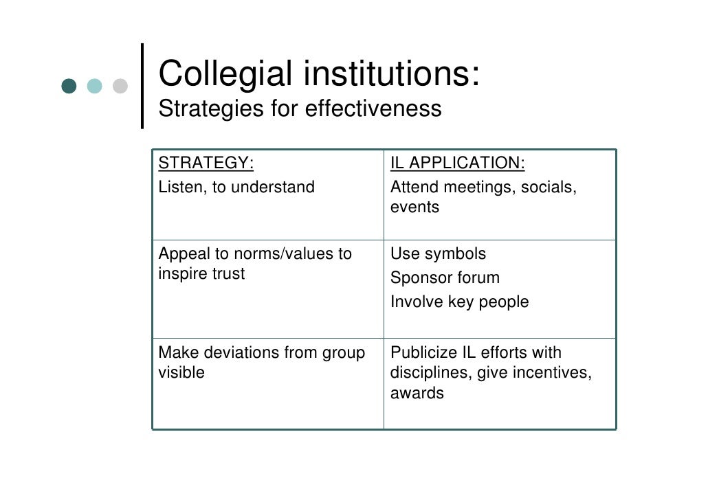 17. 17. Collegial institutions:Strategies for effectivenessSTRATEGY: IL APPLICATION:Listen, to understand Attend meetings, socials, eventsAppeal to norms/values to Use symbolsinspire trust Sponsor forum Involve key peopleMake deviations from group Publicize IL efforts withvisible disciplines, give incentives, awards
