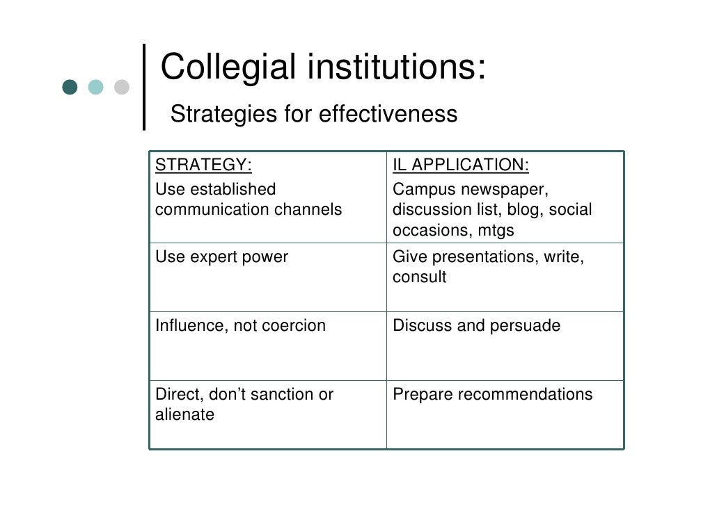 Collegial institutions:  Strategies for effectivenessSTRATEGY:                   IL APPLICATION:Use established           ...