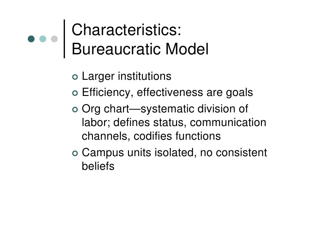 19. 19. Characteristics:Bureaucratic Model Larger institutions Efficiency, effectiveness are goals Org chart—systematic division of labor; defines status, communication channels, codifies functions Campus units isolated, no consistent beliefs