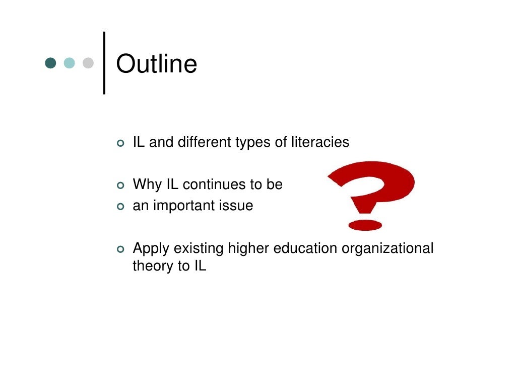 2. 2. Outline IL and different types of literacies Why IL continues to be an important issue Apply existing higher education organizational theory to IL