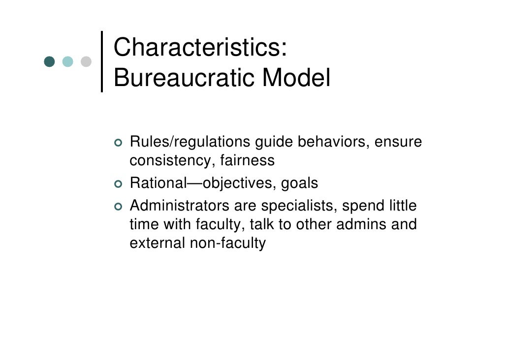 20. 20. Characteristics:Bureaucratic Model Rules/regulations guide behaviors, ensure consistency, fairness Rational—objectives, goals Administrators are specialists, spend little time with faculty, talk to other admins and external non-faculty