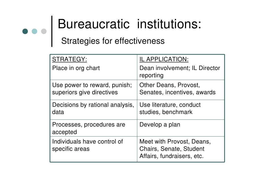 Bureaucratic institutions:   Strategies for effectivenessSTRATEGY:                       IL APPLICATION:Place in org chart...