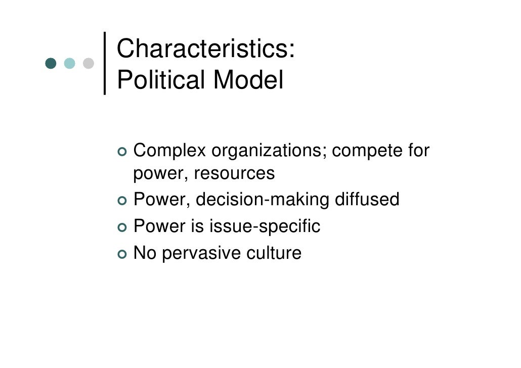 Characteristics:Political Model Complex organizations; compete for  power, resources Power, decision-making diffused Po...