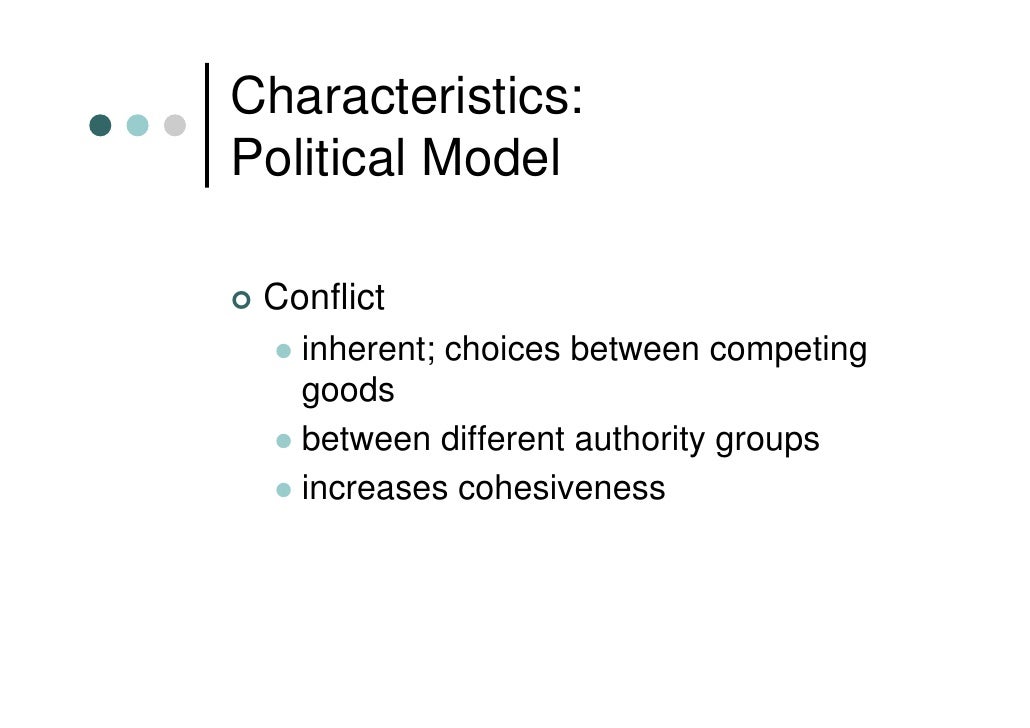 24. 24. Characteristics:Political Model Conflict  inherent; choices between competing goods  between different authority groups  increases cohesiveness
