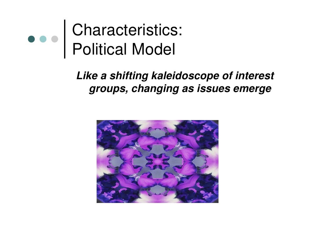 Characteristics:Political ModelLike a shifting kaleidoscope of interest   groups, changing as issues emerge