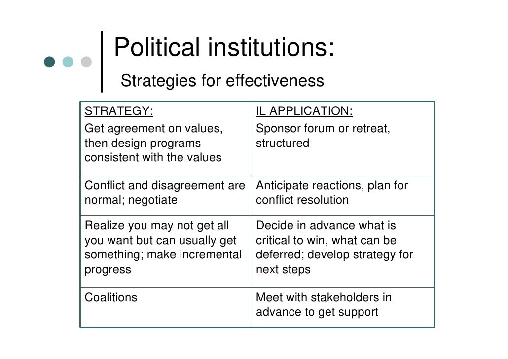 Political institutions:      Strategies for effectivenessSTRATEGY:                      IL APPLICATION:Get agreement on va...