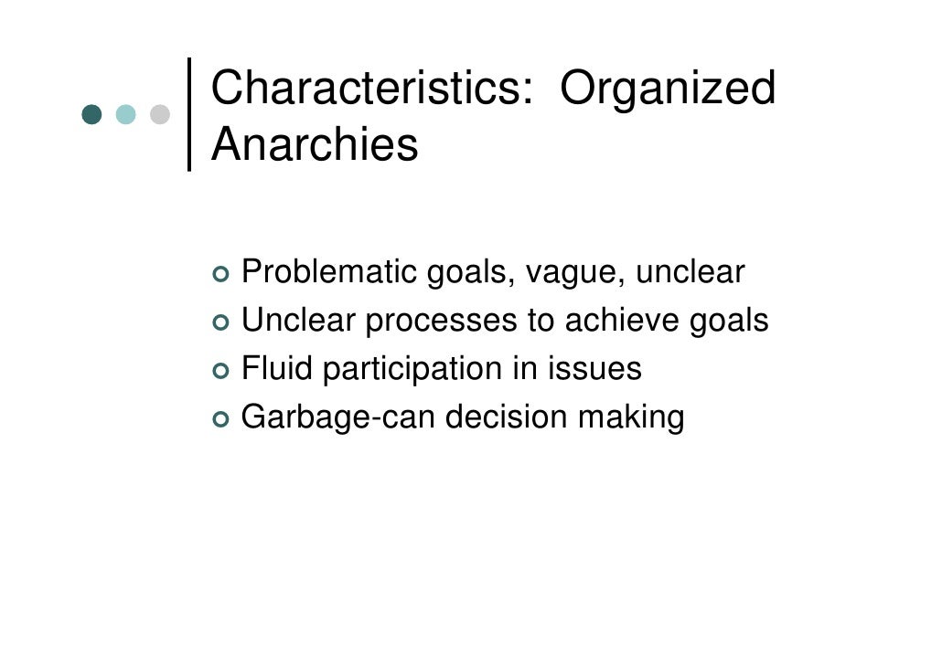 Characteristics: OrganizedAnarchies Problematic goals, vague, unclear Unclear processes to achieve goals Fluid particip...