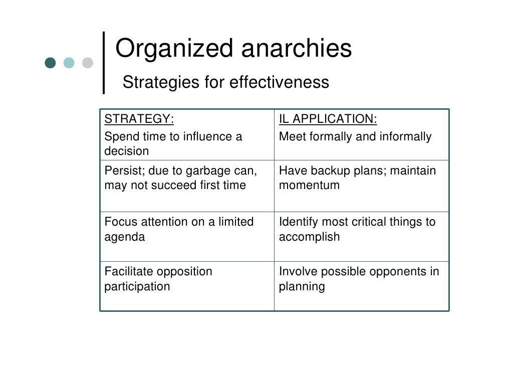Organized anarchies   Strategies for effectivenessSTRATEGY:                      IL APPLICATION:Spend time to influence a ...