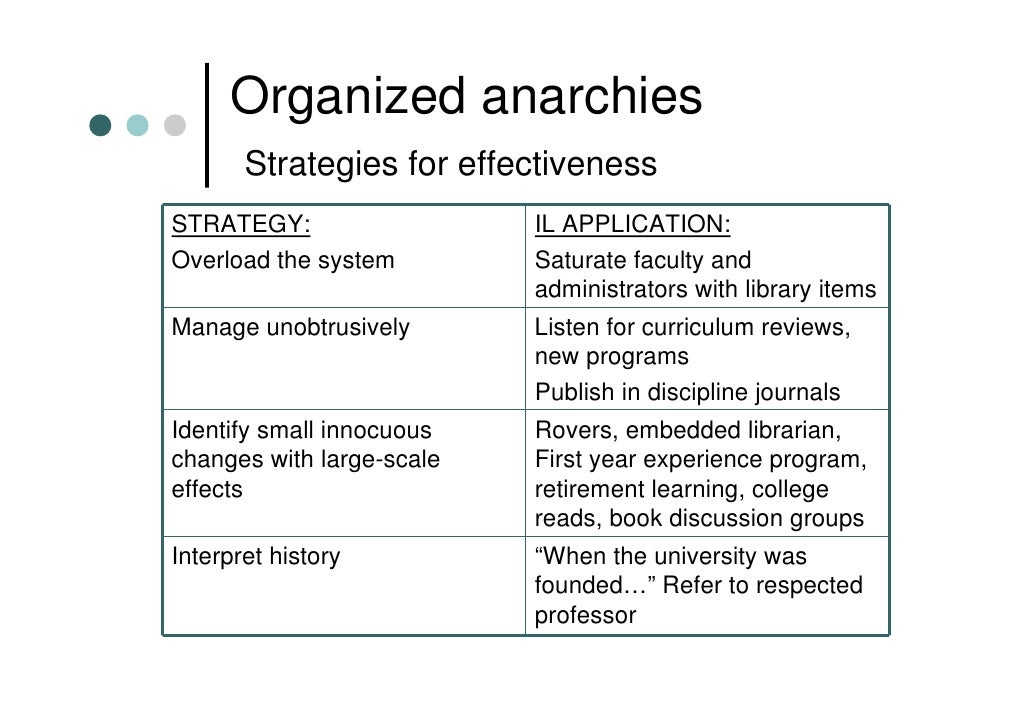 Organized anarchies       Strategies for effectivenessSTRATEGY:                  IL APPLICATION:Overload the system       ...