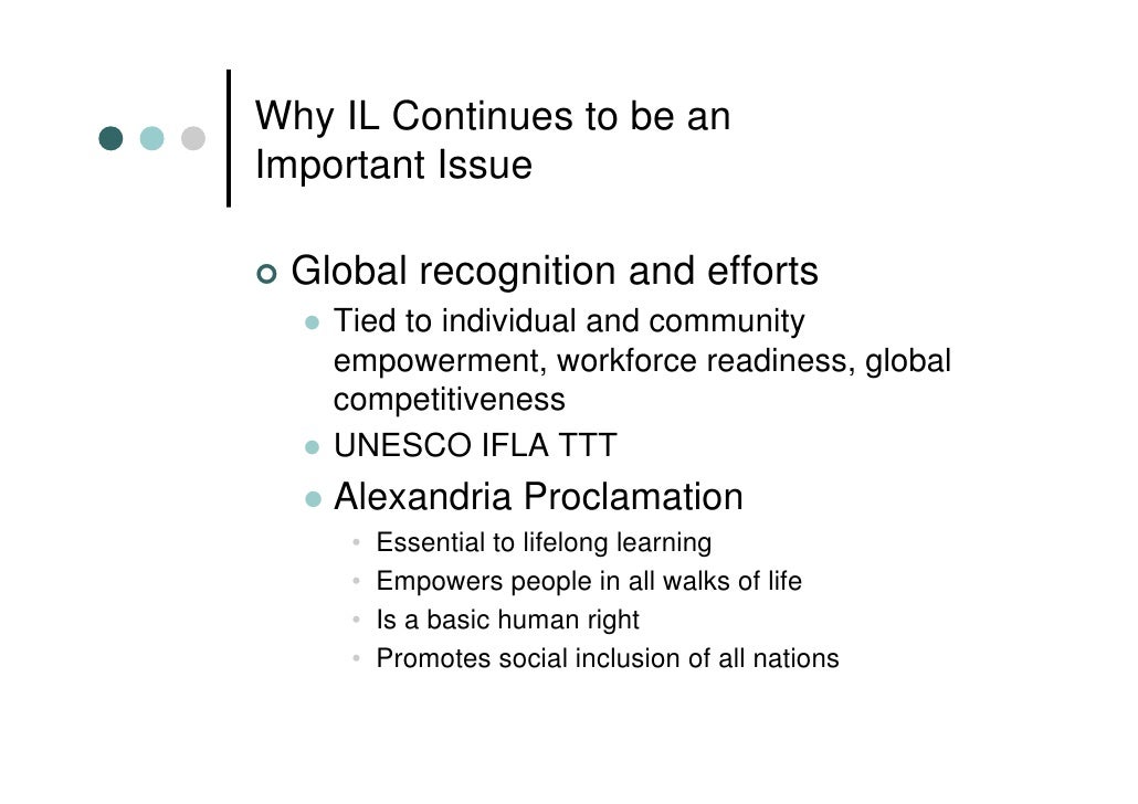 4. 4. Why IL Continues to be anImportant Issue Global recognition and efforts  Tied to individual and community empowerment, workforce readiness, global competitiveness  UNESCO IFLA TTT  Alexandria Proclamation • Essential to lifelong learning • Empowers people in all walks of life • Is a basic human right • Promotes social inclusion of all nations