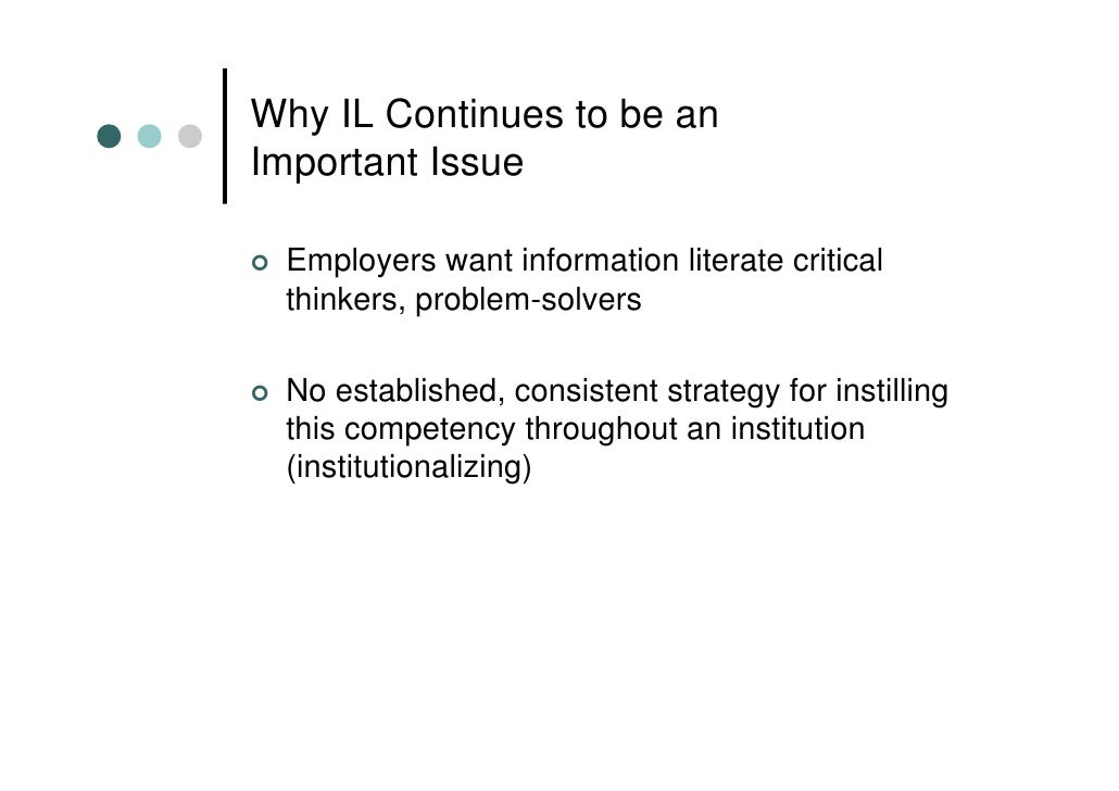 Why IL Continues to be anImportant Issue   Employers want information literate critical    thinkers, problem-solvers   N...