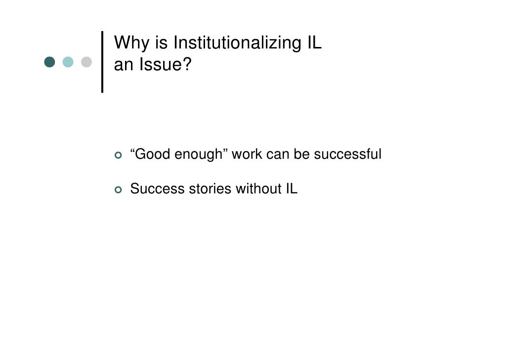 Why is Institutionalizing ILan Issue?   “Good enough” work can be successful   Success stories without IL