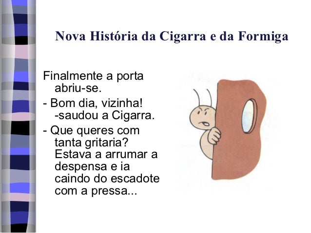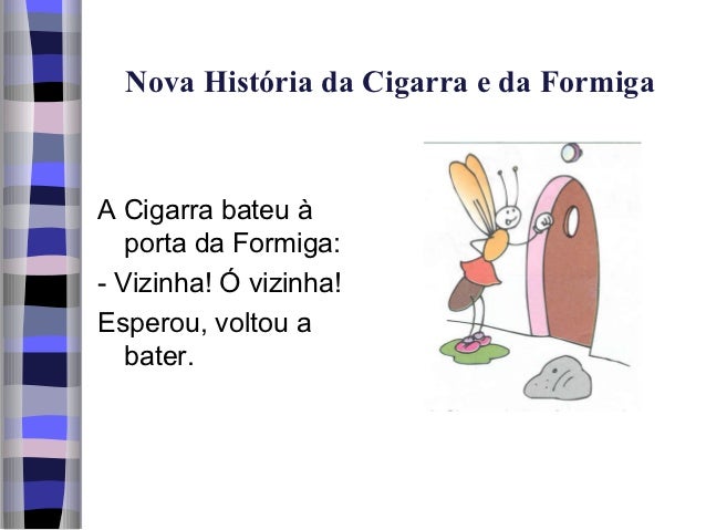 2. 2. Nova História da Cigarra e da FormigaA Cigarra bateu à porta da Formiga:- Vizinha! Ó vizinha!Esperou, voltou a bater.