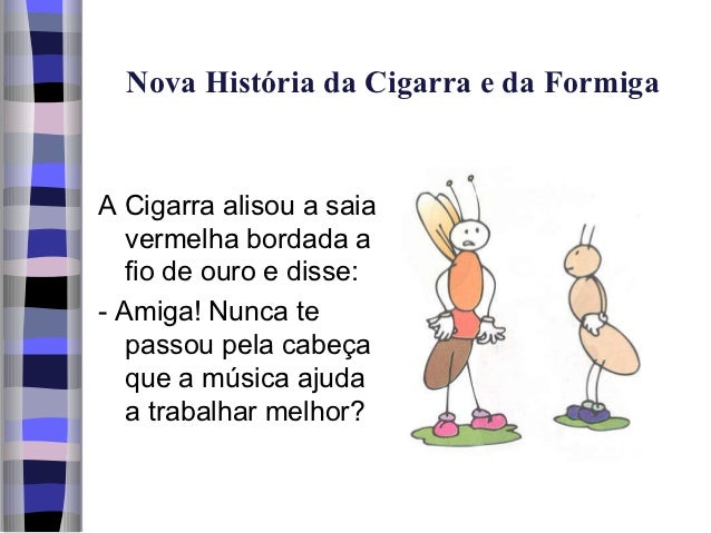 7. 7. Nova História da Cigarra e da FormigaA Cigarra alisou a saia vermelha bordada a fio de ouro e disse:- Amiga! Nunca te passou pela cabeça que a música ajuda a trabalhar melhor?