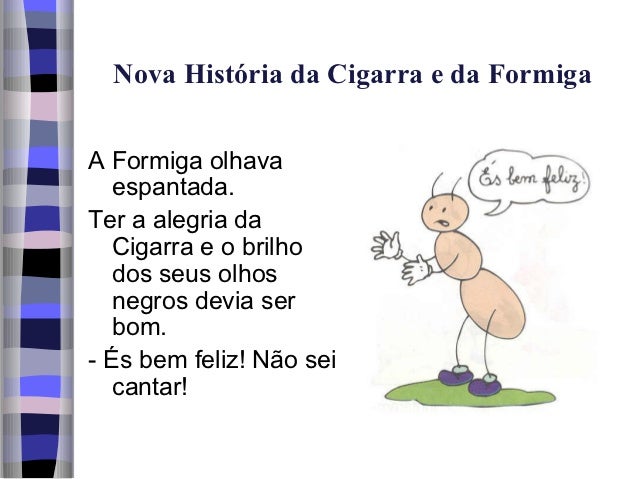 9. 9. Nova História da Cigarra e da FormigaA Formiga olhava espantada.Ter a alegria da Cigarra e o brilho dos seus olhos negros devia ser bom.- És bem feliz! Não sei cantar!