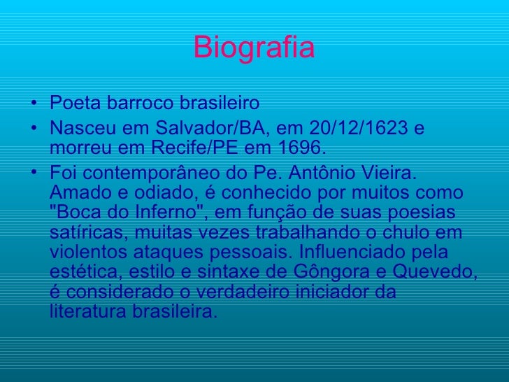 2. 2. Biografia <ul><li>Poeta barroco brasileiro </li></ul><ul><li>Nasceu em Salvador/BA, em 20/12/1623 e morreu em Recife/PE em 1696. </li></ul><ul><li>Foi contemporâneo do Pe. Antônio Vieira. Amado e odiado, é conhecido por muitos como &quot;Boca do Inferno&quot;, em função de suas poesias satíricas, muitas vezes trabalhando o chulo em violentos ataques pessoais. Influenciado pela estética, estilo e sintaxe de Gôngora e Quevedo, é considerado o verdadeiro iniciador da literatura brasileira. </li></ul>