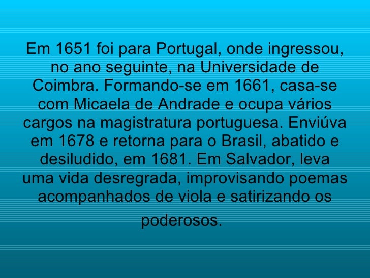 3. 3. Em 1651 foi para Portugal, onde ingressou, no ano seguinte, na Universidade de Coimbra. Formando-se em 1661, casa-se com Micaela de Andrade e ocupa vários cargos na magistratura portuguesa. Enviúva em 1678 e retorna para o Brasil, abatido e desiludido, em 1681. Em Salvador, leva uma vida desregrada, improvisando poemas acompanhados de viola e satirizando os poderosos.