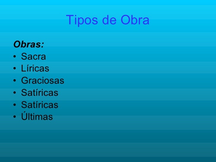 Tipos de Obra <ul><li>Obras: </li></ul><ul><li>Sacra </li></ul><ul><li>Líricas </li></ul><ul><li>Graciosas </li></ul><ul><...
