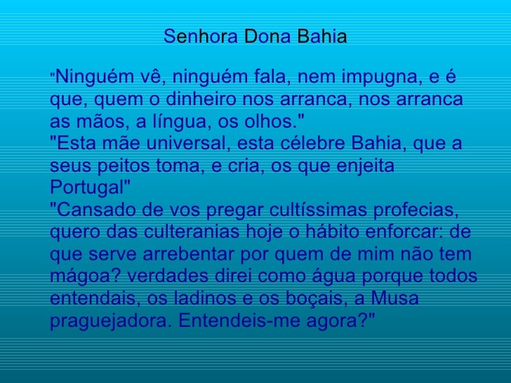 5. 5. S e n h o r a D o n a B a h i a <ul><li>&quot; Ninguém vê, ninguém fala, nem impugna, e é que, quem o dinheiro nos arranca, nos arranca as mãos, a língua, os olhos.&quot; &quot;Esta mãe universal, esta célebre Bahia, que a seus peitos toma, e cria, os que enjeita Portugal&quot; &quot;Cansado de vos pregar cultíssimas profecias, quero das culteranias hoje o hábito enforcar: de que serve arrebentar por quem de mim não tem mágoa? verdades direi como água porque todos entendais, os ladinos e os boçais, a Musa praguejadora. Entendeis-me agora?&quot; </li></ul>