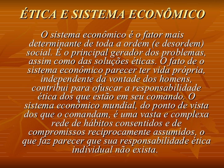 9. 11. ÉTICA E SISTEMA ECONÔMICO <ul><li>O sistema econômico é o fator mais determinante de toda a ordem (e desordem) social. É o principal gerador dos problemas, assim como das soluções éticas. O fato de o sistema econômico parecer ter vida própria, independente da vontade dos homens, contribui para ofuscar a responsabilidade ética dos que estão em seu comando. O sistema econômico mundial, do ponto de vista dos que o comandam, é uma vasta e complexa rede de hábitos consentidos e de compromissos reciprocamente assumidos, o que faz parecer que sua responsabilidade ética individual não exista. </li></ul>