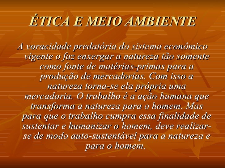 10. 13. ÉTICA E MEIO AMBIENTE <ul><li>A voracidade predatória do sistema econômico vigente o faz enxergar a natureza tão somente como fonte de matérias-primas para a produção de mercadorias. Com isso a natureza torna-se ela própria uma mercadoria. O trabalho é a ação humana que transforma a natureza para o homem. Mas para que o trabalho cumpra essa finalidade de sustentar e humanizar o homem, deve realizar-se de modo auto-sustentável para a natureza e para o homem. </li></ul>