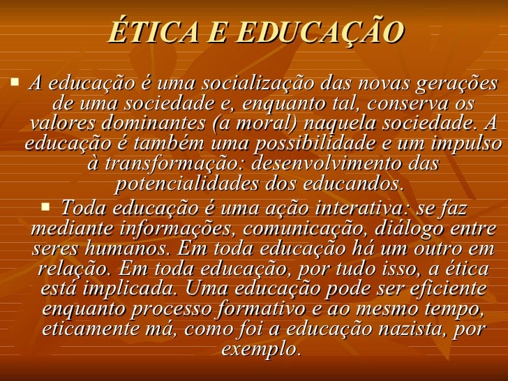 11. 16. ÉTICA E EDUCAÇÃO <ul><li>A educação é uma socialização das novas gerações de uma sociedade e, enquanto tal, conserva os valores dominantes (a moral) naquela sociedade. A educação é também uma possibilidade e um impulso à transformação: desenvolvimento das potencialidades dos educandos. </li></ul><ul><li>Toda educação é uma ação interativa: se faz mediante informações, comunicação, diálogo entre seres humanos. Em toda educação há um outro em relação. Em toda educação, por tudo isso, a ética está implicada. Uma educação pode ser eficiente enquanto processo formativo e ao mesmo tempo, eticamente má, como foi a educação nazista, por exemplo . </li></ul>