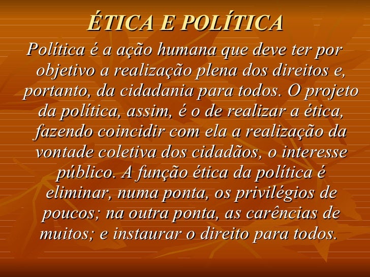 12. 19. ÉTICA E POLÍTICA <ul><li>Política é a ação humana que deve ter por objetivo a realização plena dos direitos e, portanto, da cidadania para todos. O projeto da política, assim, é o de realizar a ética, fazendo coincidir com ela a realização da vontade coletiva dos cidadãos, o interesse público. A função ética da política é eliminar, numa ponta, os privilégios de poucos; na outra ponta, as carências de muitos; e instaurar o direito para todos. </li></ul>