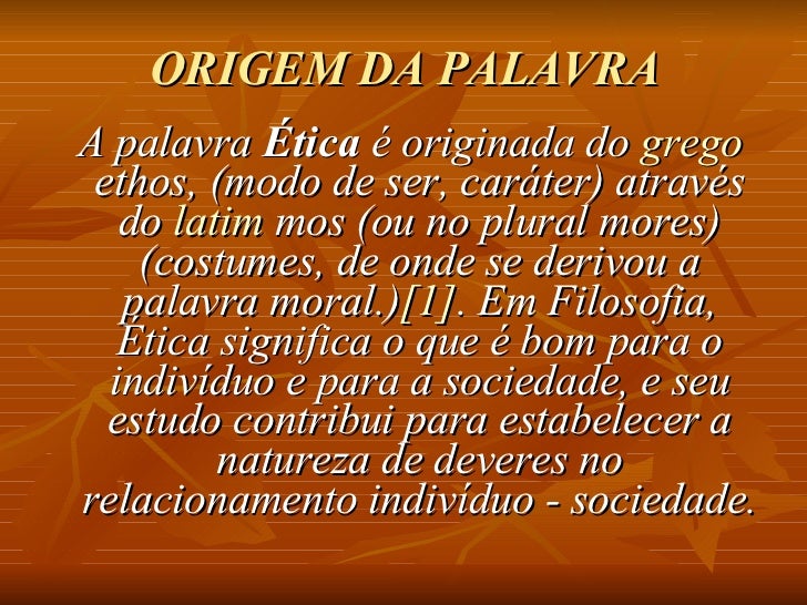 2. 2. ORIGEM DA PALAVRA <ul><li>A palavra Ética é originada do grego ethos, (modo de ser, caráter) através do latim mos (ou no plural mores) (costumes, de onde se derivou a palavra moral.) [1] . Em Filosofia, Ética significa o que é bom para o indivíduo e para a sociedade, e seu estudo contribui para estabelecer a natureza de deveres no relacionamento indivíduo - sociedade. </li></ul>