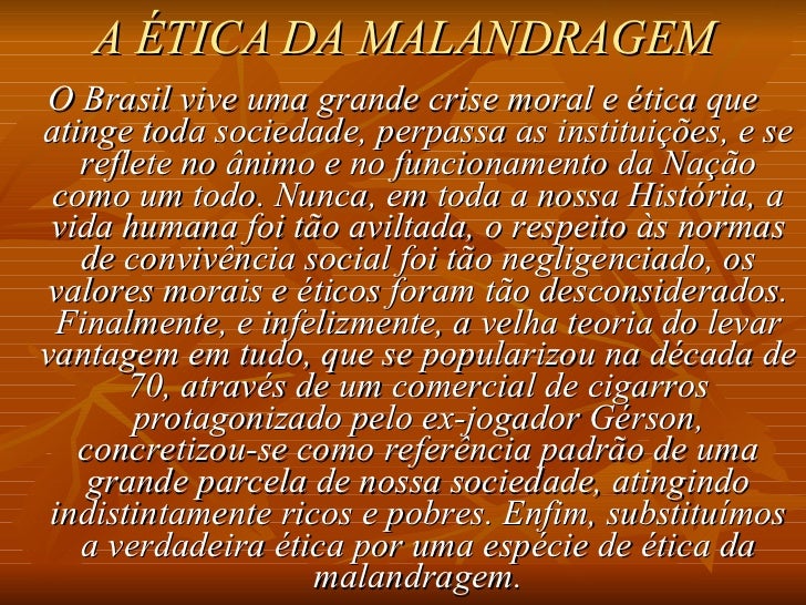 13. 27. A ÉTICA DA MALANDRAGEM <ul><li>O Brasil vive uma grande crise moral e ética que atinge toda sociedade, perpassa as instituições, e se reflete no ânimo e no funcionamento da Nação como um todo. Nunca, em toda a nossa História, a vida humana foi tão aviltada, o respeito às normas de convivência social foi tão negligenciado, os valores morais e éticos foram tão desconsiderados. Finalmente, e infelizmente, a velha teoria do levar vantagem em tudo, que se popularizou na década de 70, através de um comercial de cigarros protagonizado pelo ex-jogador Gérson, concretizou-se como referência padrão de uma grande parcela de nossa sociedade, atingindo indistintamente ricos e pobres. Enfim, substituímos a verdadeira ética por uma espécie de ética da malandragem. </li></ul>